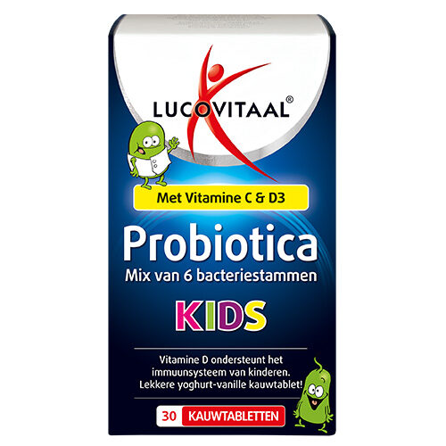 Lucovitaal Probiotica Kids kauwtabletten met yoghurt-vanille smaak zijn speciaal samengesteld voor kinderen vanaf 3 jaar. Vitamine D draagt bij aan een normale groei en ontwikkeling van de botten en ondersteunt het immuunsysteem van kinderen. Vitamine C is belangrijk voor sterke tanden. Daarnaast bevat deze bijzondere formule 6 geselecteerde bacteriestammen: Bifidobacterium breve Bifidobacterium lactis Bifidobacterium longum Lactobacillus acidophilus Lactobacillus plantarum Streptococcus thermophiles De geselecteerde bacteriestammen overleven het maagzuur en bereiken de darmen.