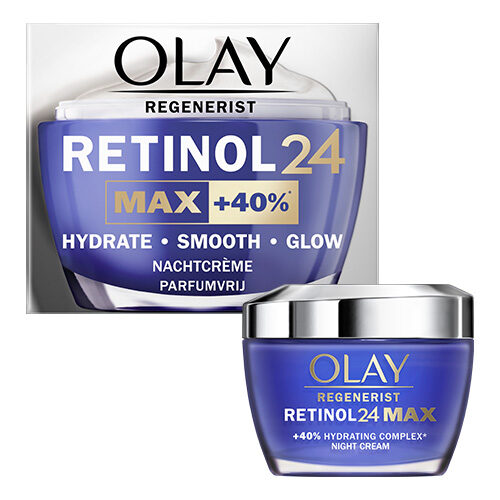 Olay Regenerist Retinol24 MAX nachtcrème hydrateert, verzacht en revitaliseert de gloed van de huid. Deze parfum vrije crème met de krachtigste formule van Olay met retinoïde + vitamine B3 bevat 40% meer hydraterende bestanddelen* zodat je huid nog gehydrateerder aanvoelt. Zie verbeteringen in fijne lijntjes en rimpels, gladheid, helderheid, versteviging, donkere vlekken en poriën. De crème is van parfum en kunstmatige kleurstoffen.