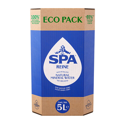De puurheid van SPA® Reine in een 5L Eco Pack: handig én ecologisch. SPA® REINE in een handig formaat van 5 liter met -65% plastic (in vergelijking met packs SPA® Reine 6x1L en 6×1,5L), 100% recyclebaar, makkelijk te transporteren met zijn handvat en te gebruiken met zijn compacte formaat een kraantje. Handig in de keuken, in de koelkast, voor de flesjes van je baby, maar ook tijdens een picknick met familie of vrienden!